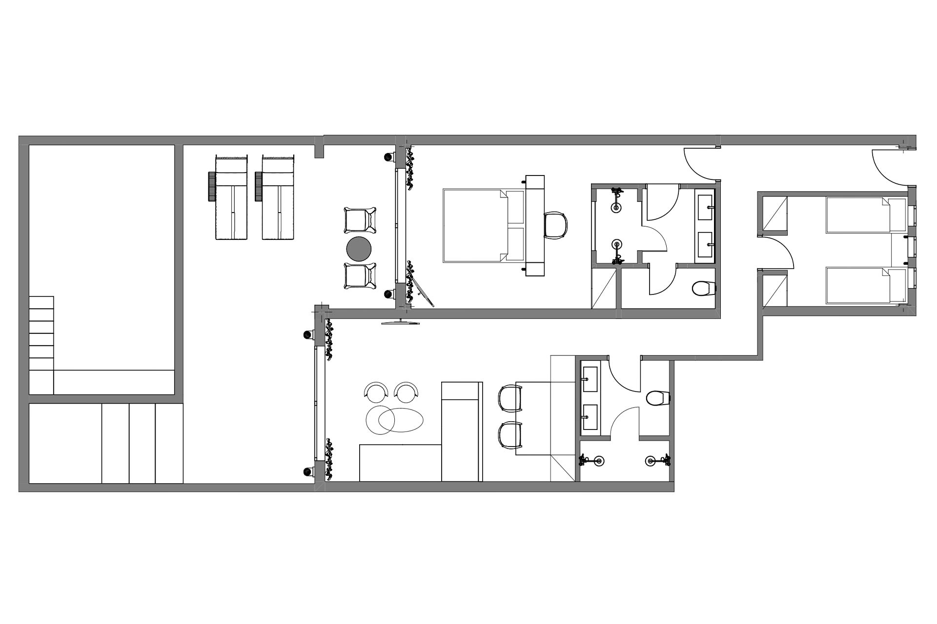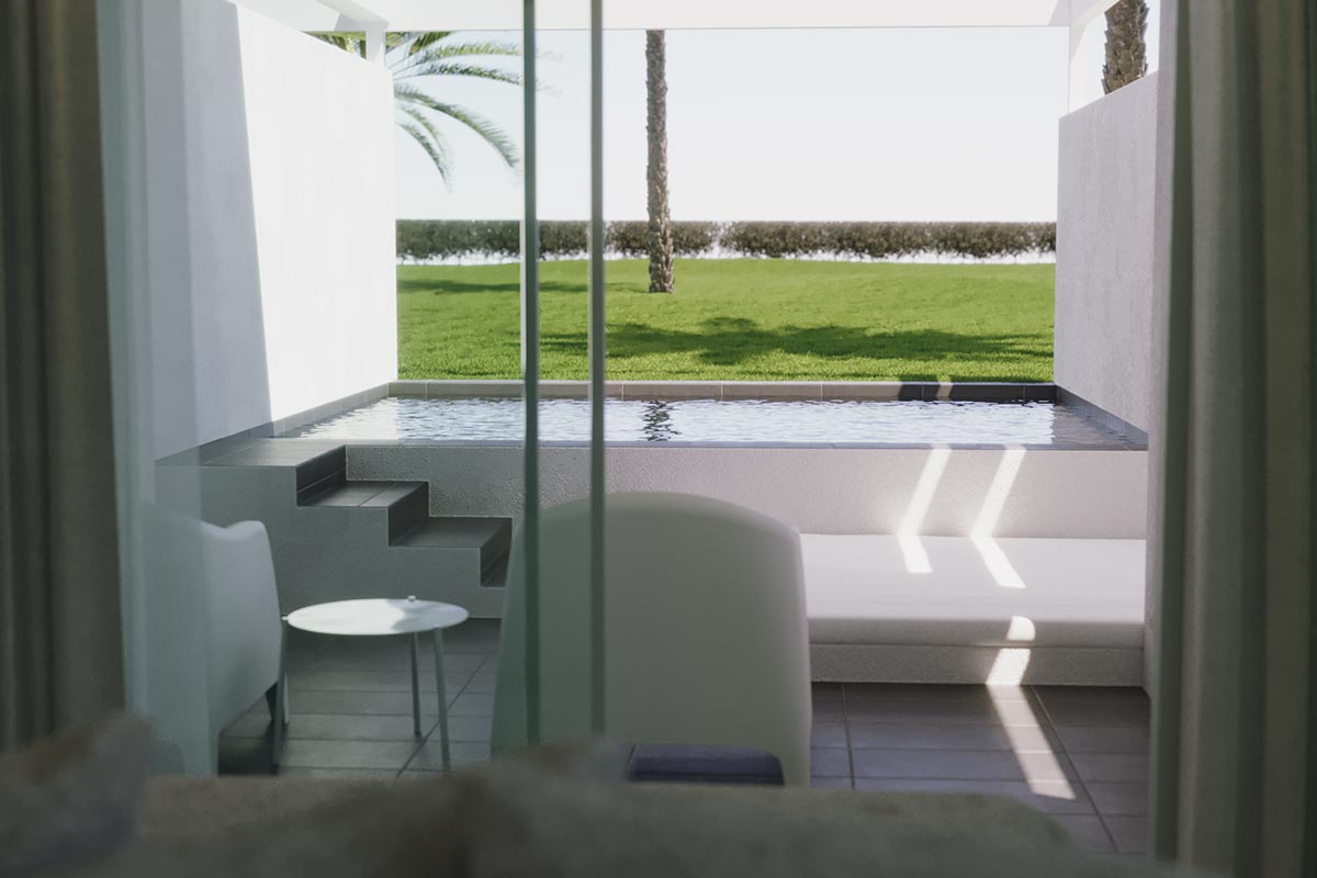 This Two-Bedroom Suite with Private Pool provides a living room with two sofa beds, two separate bedrooms and a big terrace.
